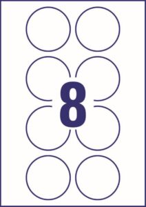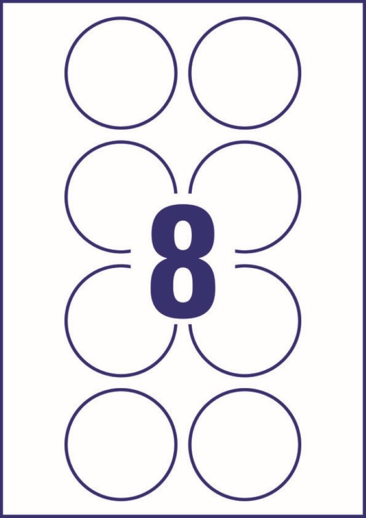 průměr 65 mm, 10 archů A4, 80 ks etiket v balení (8 ks/arch), papírové, permanentní lepidlo, barva bílá. Typ tiskárny: černobílá laserová, barevná laserová, inkoustová.
