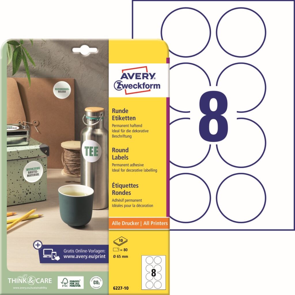 Kulaté samolepící etikety Avery Zweckform 6227-10 do kanceláře, obchodu i domácnosti, které vyniknou svým zvláštním tvarem a pomohou zdůraznit originalitu a jedinečnost. Vysoká a stálá lepivost na běžných površích jako je papír, karton, sklo nebo plast. Při tisku se můžete spolehnout na plynulý průjezd archů tiskárnou bez uvíznutí a ostrý tiskový výstup, který se díky vynikajícímu ukotvení tonerového prášku nebo inkoustu nerozmazává. Samozřejmostí je čtyřstranný bezpečnostní okraj QCT (Quattro Clean Technology), který zabraňuje vytékání a usazování lepidla v tiskárně. Etikety kulatého formátu o průměru 65 mm Avery 6227-10 jsou vhodné pro všechny běžné laserové i inkoustové tiskárny, kopírovací stroje a hodí se i pro psaní, resp. ruční popis.