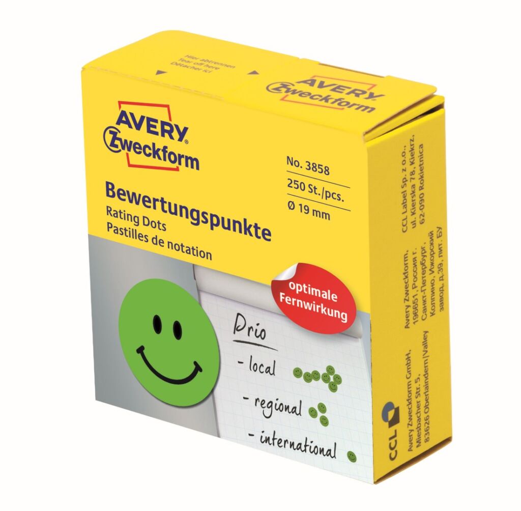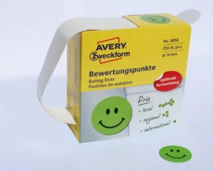 Samolepící pozitivní smajlík Avery Zweckform 3858 na jednoduché a přehledné hodnotící nebo motivační značení. Spolehlivá lepivost na všech běžných typech povrchů, snadná manipulace a skladování díky praktickému zásobníku z pevného papíru.