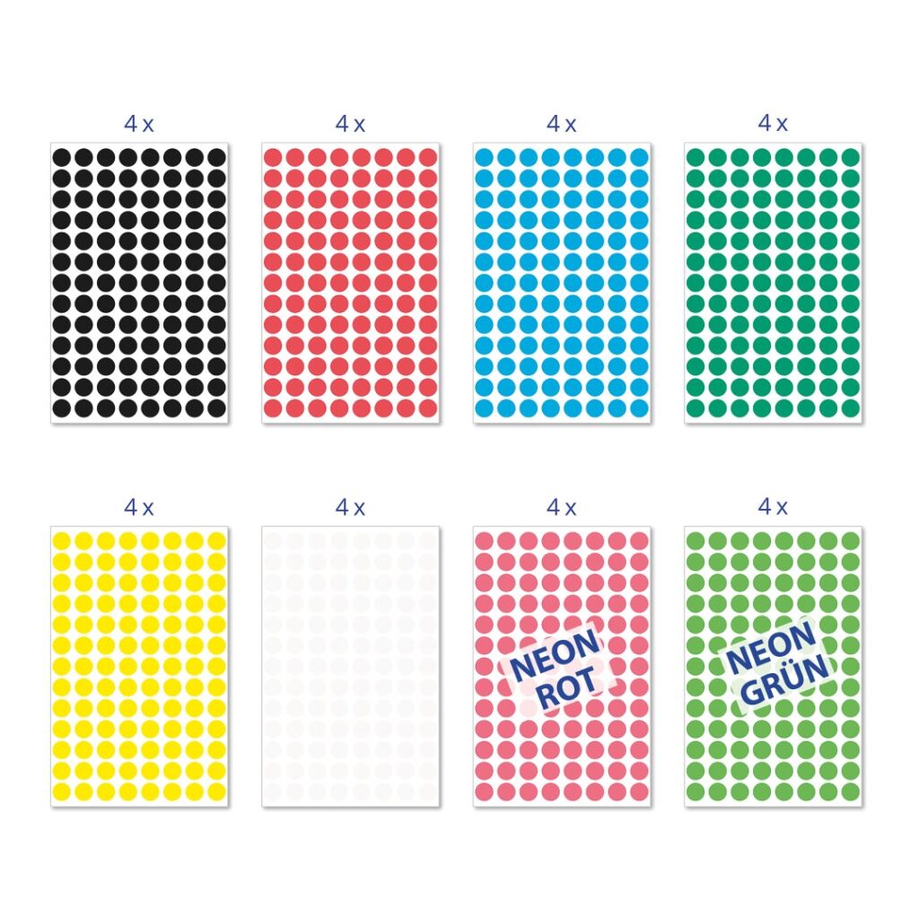 průměr 8 mm, 3.328 ks etiket v balení (8 barev á 416 ks), papírové, permanentní lepidlo, barva bílá, černá, červená, modrá, neonově červená, neonově zelená, zelená, žlutá.