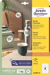 Kulaté snímatelné etikety Avery Zweckform 6229REV-10 do kanceláře, obchodu i domácnosti, které vyniknou svým zvláštním tvarem a pomohou zdůraznit originalitu a jedinečnost. Ideální na veškeré dočasné nebo měnící se značení. Etikety se snímatelným lepidlem spolehlivě a bezpečně drží, a naopak je lze snadno odlepit, bez zanechání žádných stop zbytkového lepidla. Ukázka viz Videa (záložka výše). Při tisku se můžete spolehnout na plynulý průjezd archů tiskárnou bez uvíznutí a ostrý tiskový výstup, který se díky vynikajícímu ukotvení tonerového prášku nebo inkoustu nerozmazává. Samozřejmostí je čtyřstranný bezpečnostní okraj QCT (Quattro Clean Technology), který zabraňuje vytékání a usazování lepidla v tiskárně. Bílé kulaté samolepky o průměru 80 mm Avery Zweckform 6229REV-10 jsou vhodné pro všechny běžné laserové i inkoustové tiskárny, kopírovací stroje a hodí se i pro psaní, resp. ruční popis.