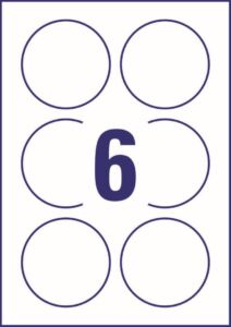 kolečka průměr 80 mm, 10 archů A4, 60 ks etiket v balení (6 ks/arch), papírové, snímatelné lepidlo, barva bílá. Typ tiskárny: černobílá laserová, barevná laserová, inkoustová.