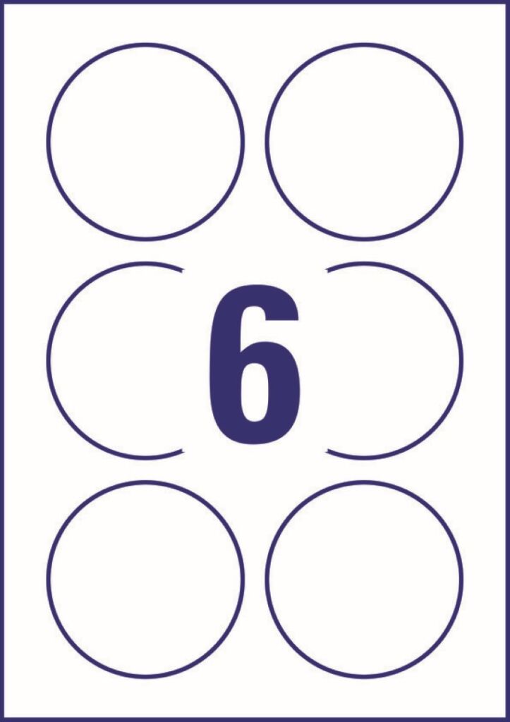 10 archů A4, kolečka průměr 80 mm, 60 ks etiket v balení, papírové, snímatelné lepidlo, barva bílá. Typ tiskárny: černobílá laserová, barevná laserová, inkoustová.