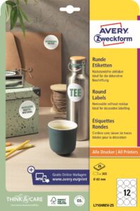Kulaté snímatelné etikety Avery Zweckform L7104REV-25 do kanceláře, obchodu i domácnosti, které vyniknou svým zvláštním tvarem a pomohou zdůraznit originalitu a jedinečnost. Ideální na veškeré dočasné nebo měnící se značení. Etikety se snímatelným lepidlem spolehlivě a bezpečně drží, a naopak je lze snadno odlepit, bez zanechání žádných stop zbytkového lepidla. Ukázka viz Videa (záložka výše). Při tisku se můžete spolehnout na plynulý průjezd archů tiskárnou bez uvíznutí a ostrý tiskový výstup, který se díky vynikajícímu ukotvení tonerového prášku nebo inkoustu nerozmazává. Samozřejmostí je čtyřstranný bezpečnostní okraj QCT (Quattro Clean Technology), který zabraňuje vytékání a usazování lepidla v tiskárně. Bílé kulaté samolepící štítky o průměru 60 mm Avery Zweckform L7104REV-25 jsou vhodné pro všechny běžné laserové i inkoustové tiskárny, kopírovací stroje a hodí se i pro psaní, resp. ruční popis.