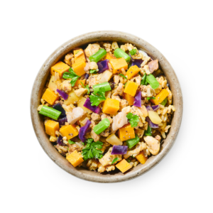 Kuřecí maso (55%), kuřecí játra (5%), hnědá rýže (5%), sladké brambory (10%), červené zelí (9%), mrkev (5%), jablko, fazalové lusky, houby, petržel, lososový olej, olivový olej, pivovarské kvasnice, chia a kurkuma.