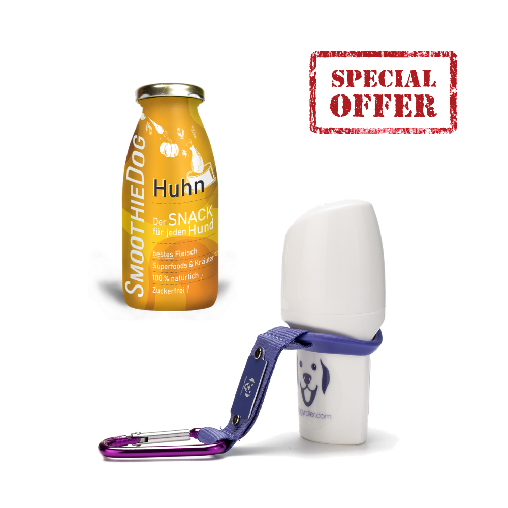 Vyzkoušejte na tréninku toto neodolatelné duo! Kuřecí psí smoothie osvěží vašeho miláčka lahodnou kuřecí svalovinou a dalšími dobrotami v tekutém skupenství ve 100% potravinářské kvalitě a Doggy roller se postará o dokonalé dávkování. Je vhodný i pro pejsky na dietě nebo po nemoci a postará se o chutnou svačinku a doplnění tekutin.