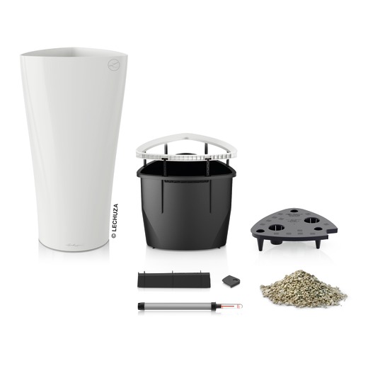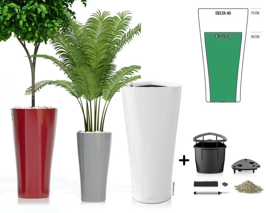 Samozavlažovací květináč Lechuza Delta je středně velký květináč sloupovitého tvaru s trojúhelníkovým profilem. K dispozici v několika barevných odstínech. Komplet obsahuje květináč, vyjímatelnou sázecí vložku, ozdobný krycí rámeček a samozavlažovací set se sáčkem Lechuza PON na drenážní vrstvu.