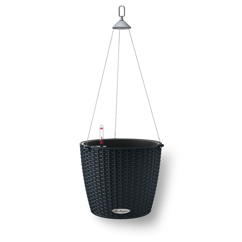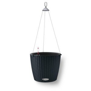 Samozavlažovací květináč vhodný na zavěšení, s povrchem imitujícím pletený ratan.