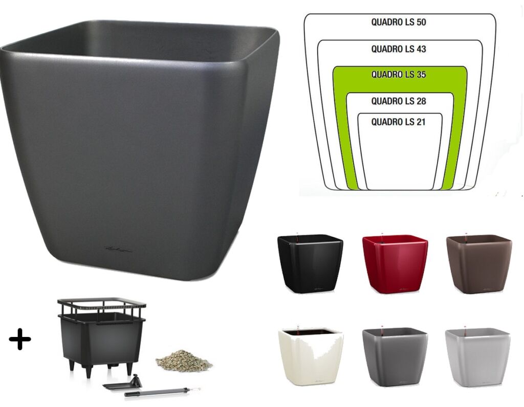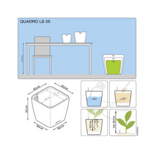 Samozavlažovací květináč Lechuza Quadro 35 patří mezi střední květináče klasického nízkého tvaru se čtvercovým profilem. K dispozici v řadě lesklých a matných odstínů. Komplet obsahuje květináč, vyjímatelnou sázecí vložku, ozdobný krycí rámeček a samozavlažovací set se sáčkem Lechuza PON na drenážní vrstvu.