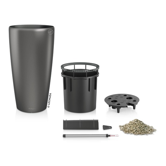 Samozavlažovací květináč Lechuza Rondo 40 je velký květináč sloupovitého tvaru s kulatým profilem. K dispozici v několika barevných odstínech. Komplet obsahuje květináč, vyjímatelnou sázecí vložku, ozdobný krycí rámeček a samozavlažovací set se sáčkem Lechuza PON na drenážní vrstvu.