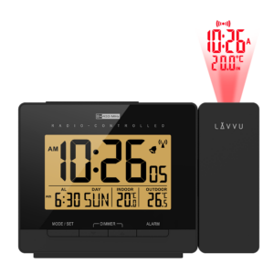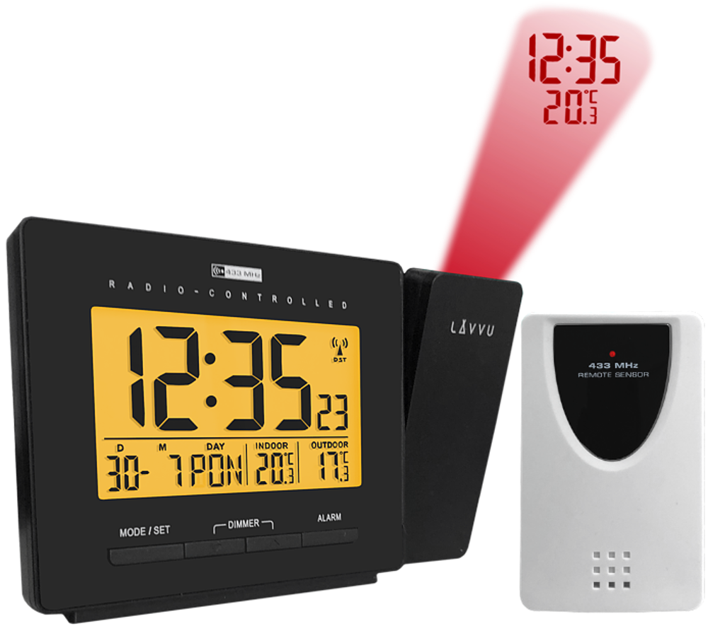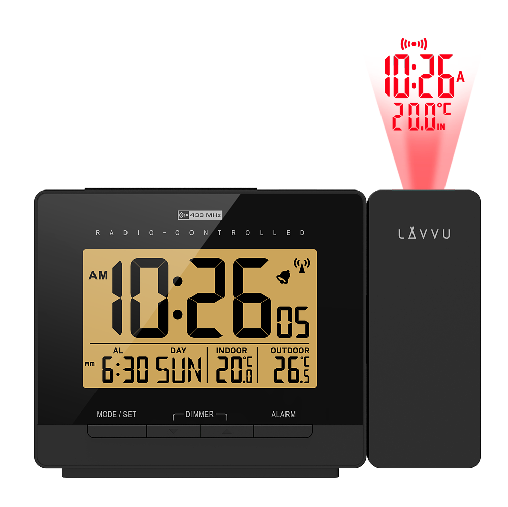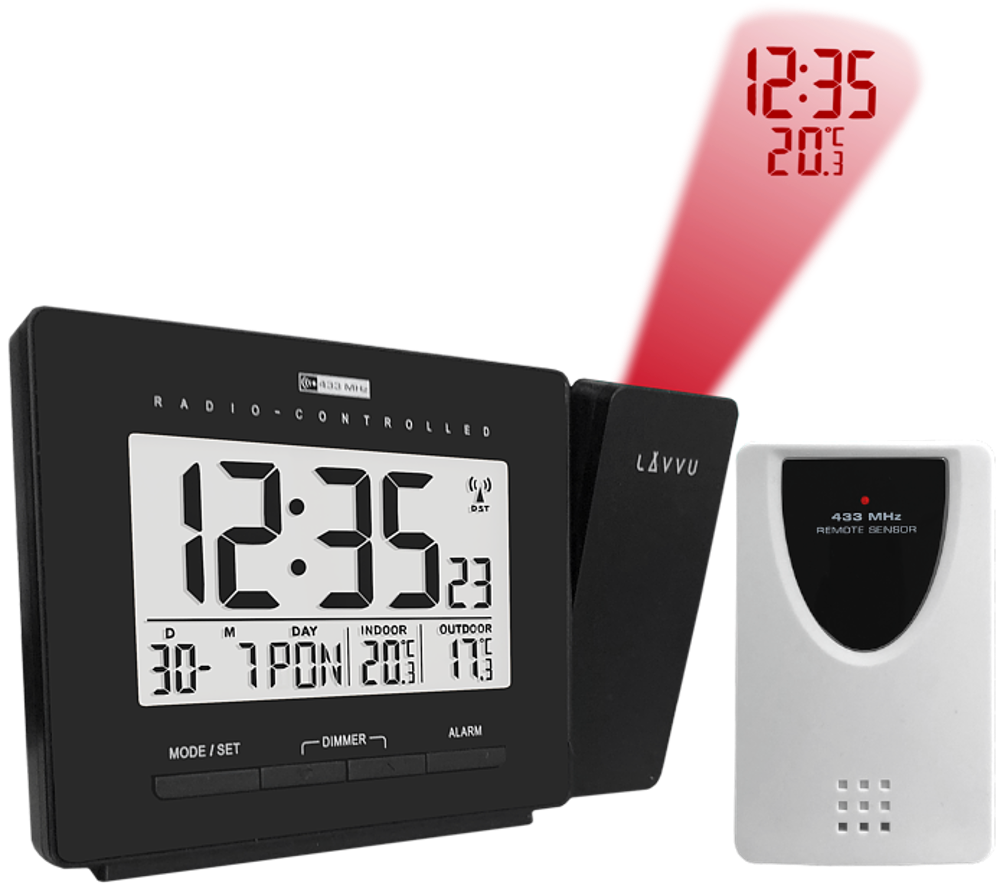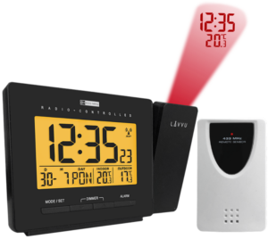 Moderní digitální budík LAVVU PROJECTION má tolik užitečných funkcí, že se rázem stane vaším oblíbeným společníkem na nočním stolku. Mezi jeho největší přednosti patří rádiem řízený čas, díky kterému je budík naprosto přesný a automaticky se v průběhu dne seřizuje podle signálu z Německa. Další výhodou je nejen ukazatel teploty v místnosti v rozsahu od -10°C do 50°C, ale především venkovní teplotní čidlo, se kterým budete ihned po probuzení vědět, jaká je teplota za oknem v rozsahu od -20°C do 50°C.
