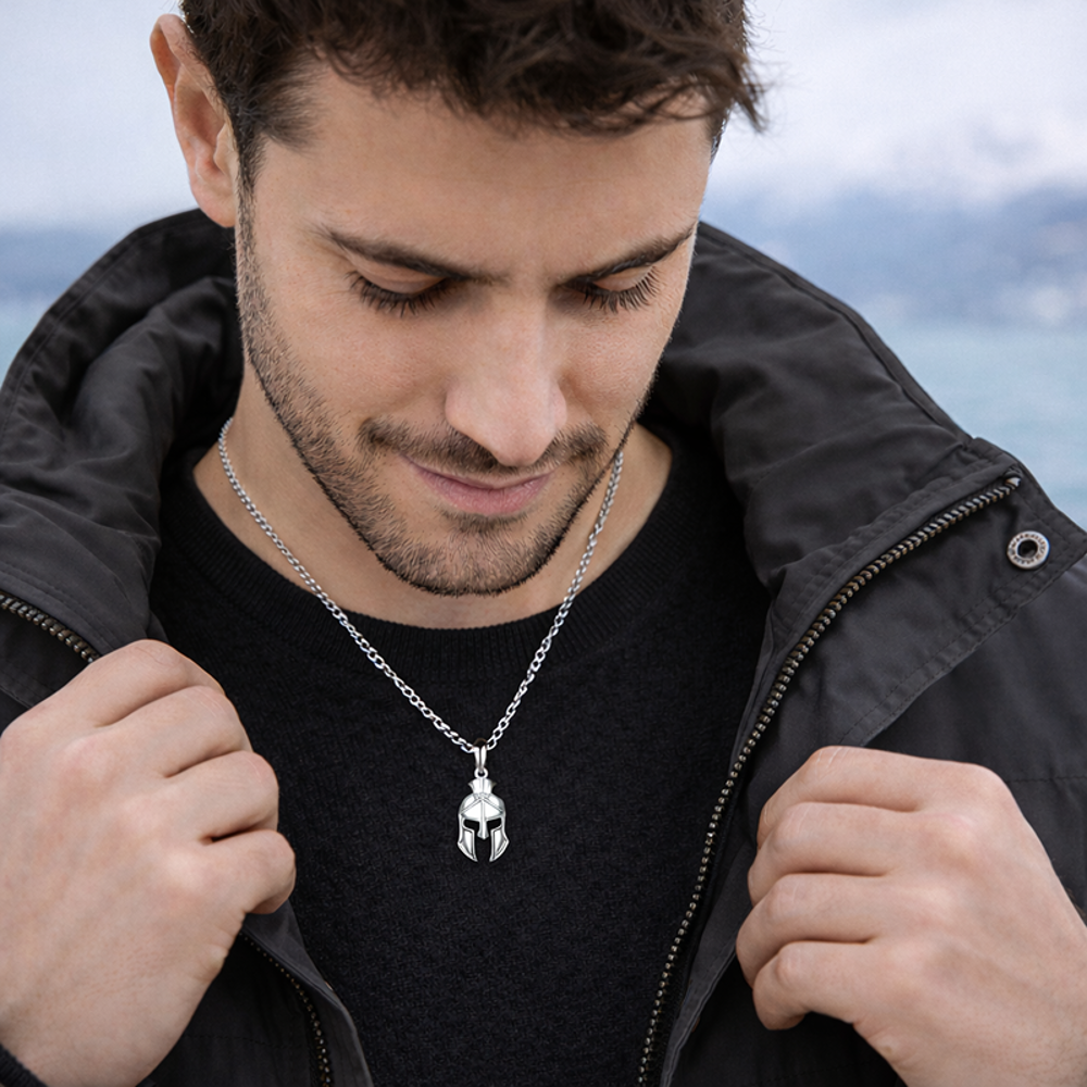 Pánský náhrdelník LAVVU je vyroben z pravého rhodiovaného stříbra Ag 925/1000, které si dlouho udrží svou barvu i lesk. Přívěsek má motiv spartské helmy – symbol síly, odvahy a disciplíny.