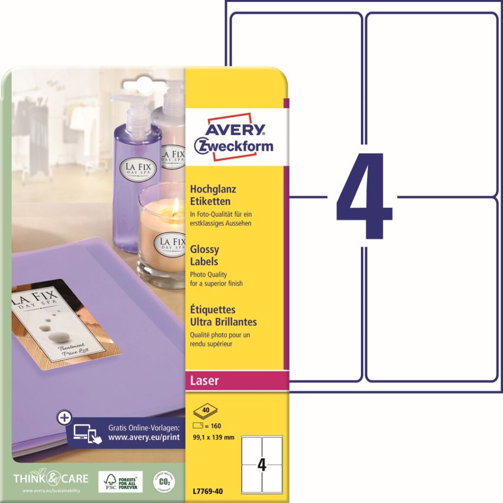 Lesklé etikety Avery Zweckform L7769-40 jsou ideální na profesionální značení výrobků, zboží, propagačních předmětů a materiálů, samolepících fotografií atd. Vysoká lepivost na různých typech povrchů. Při tisku se můžete spolehnout na hladký průjezd archů tiskárnou bez uvíznutí a ostrý tiskový výstup ve fotografické kvalitě, který se díky vynikajícímu ukotvení tonerového prášku nerozmazává. Samozřejmostí je čtyřstranný bezpečnostní okraj QCT (Quattro Clean Technology), který zabraňuje vytékání a usazování lepidla v tiskárně. Bílé vysoce lesklé samolepící etikety Avery L7769-40 jsou vhodné pro všechny běžné černobílé i barevné laserové tiskárny.