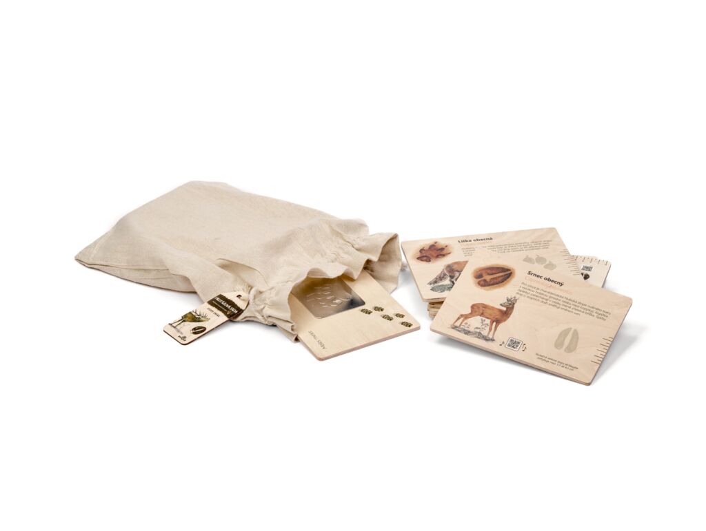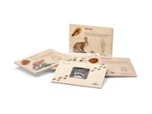 Na každé kartě najdete věrnou ilustraci vybraného zvířete a jeho stopy, ilustraci stopy v reálné velikosti, básničku a frotáž stopy.
