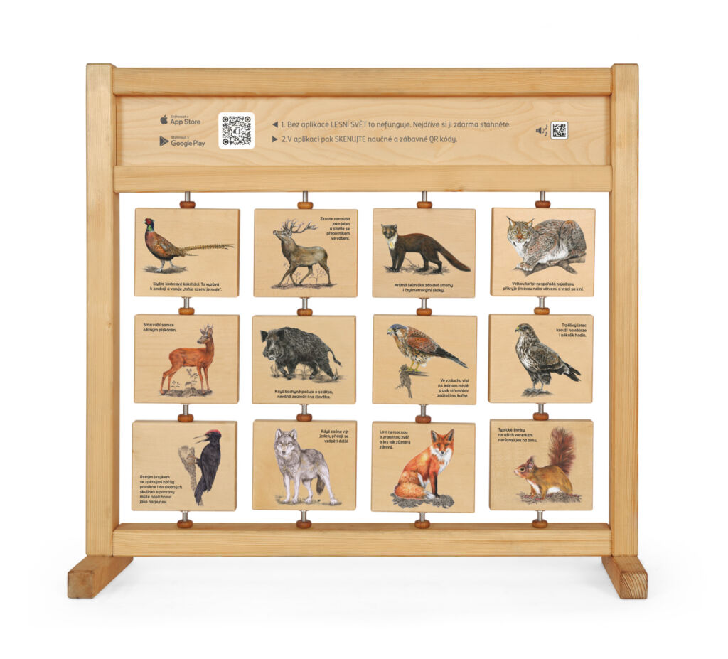 Po stažení aplikace „Lesní Svět“ a načtení QR kódu, který naleznete na otočné tabulce, se můžete dozvědět spoustu dalších informací včetně hlasu zvířete.