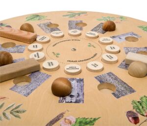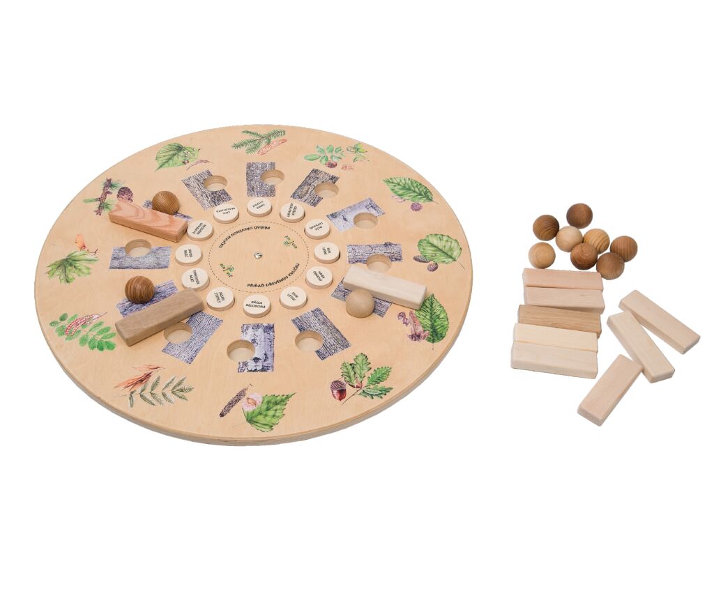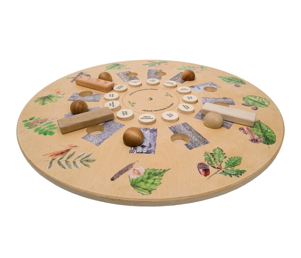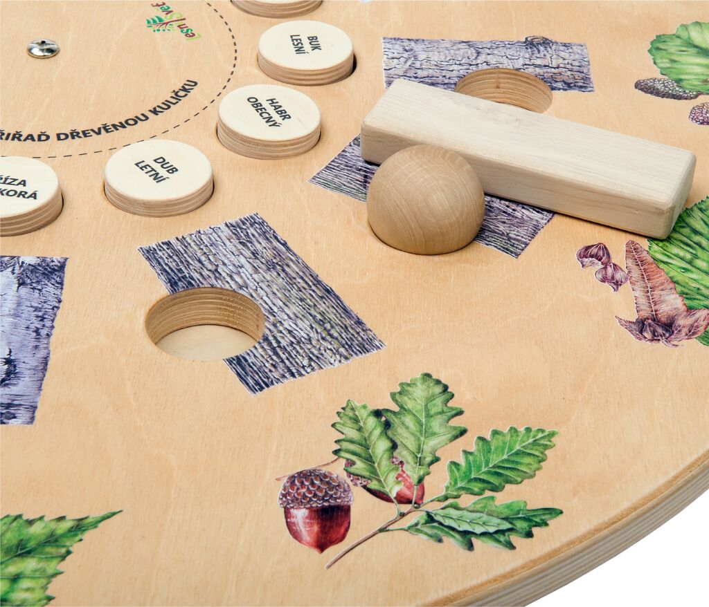 2 úrovně určování 12 druhů dřevin – DUB, BUK, LÍPA, JASAN, BŘÍZA, AKÁT, OLŠE, SMRK, MODŘÍN, JAVOR, HABR, BOROVICE. Cíl: 1/ k ilustracím list/plod/borka přiřadit správný žeton s názvem stromu a 2/ zasadit do správných otvorů 12 dřevěných kuliček jednotlivých dřevin, z nichž jsou vyrobené.