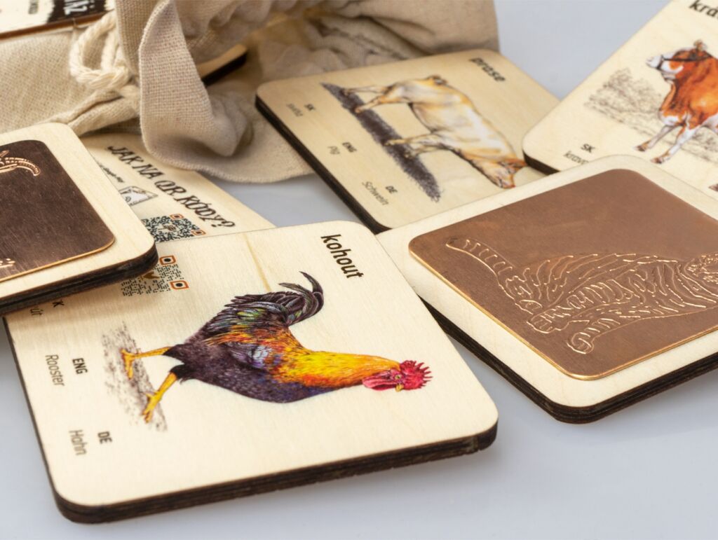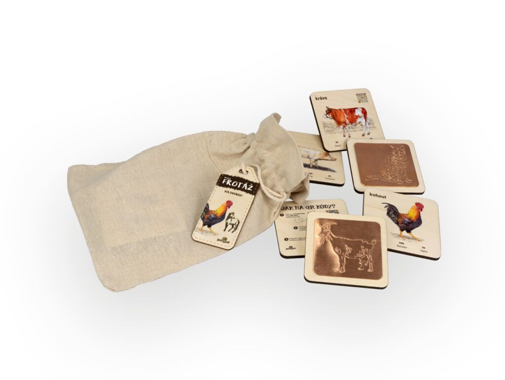 Je na čase objevit uměleckou techniku frotážování s unikátní sadou z Lesního Světa!Frotážovou sadu vyrábí u nás v dílně české ruce z kvalitního českého certifikovaného dřeva. Balení obsahuje 11 dřevěných karet včetně návodu o rozměru 9 × 9 cm s měděno-zinkovými nebo hliníkovými frotážovými destičkami a QR kódy. Zabaleno v přírodním látkovém pytlíku. Autorem kreseb jsou čeští ilustrátoři, obrázky jsou chráněny autorskými právy. Výrobek je zapsán v rejstříku chráněných průmyslových vzorů EU. Frotážová sada zábavnou a hravou formou seznamuje děti i dospělé s přírodou. Na každé kartě najdete věrnou ilustraci vybraného zvířete, QR kód, latinský název a také název ve slovenštině, němčině a angličtině. Z druhé strany každé karty je frotážová destička. Po stažení aplikace „Lesní Svět“ a načtení QR kódu, který naleznete na každé kartě, si můžete pustit hlas zvířete a dozvědět se spoustu dalších informací. Frotáž je výtvarná technika přenosu obrázku z šablony na papír. NÁVOD: Na šablonu která je na destičce, položte papír a obyčejnou tužkou po něm přejíždějte, až se obrázek na papíře objeví. Obsahuje tato zvířata: krocan, kočka, kohout, kráva, kůň, ovce, prase, králík, koza, kachna Výrobek je zapsán v rejstříku chráněných průmyslových vzorů EU. Lesní svět = značka s ekologickým certifikátem udržitelného hospodářství PEFC. Všechny výrobky jsou vyrobeny s ohledem na životní prostředí.