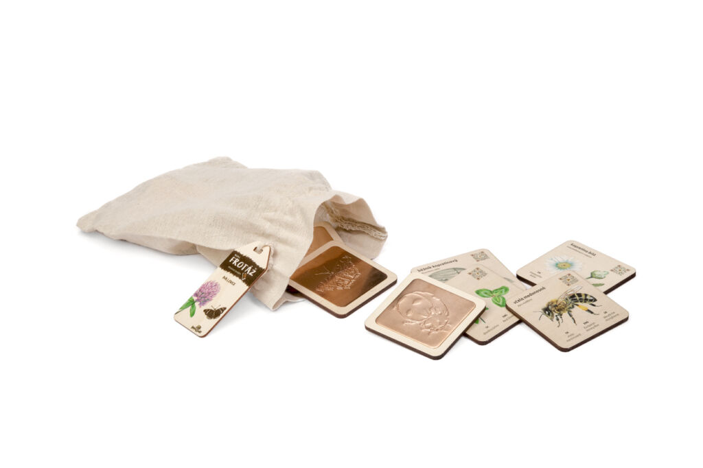 Je na čase objevit uměleckou techniku frotážování s unikátní sadou z Lesního Světa!Frotážovou sadu vyrábí u nás v dílně české ruce z kvalitního českého certifikovaného dřeva. Balení obsahuje 11 dřevěných karet včetně návodu o rozměru 9 × 9 cm s měděno-zinkovými nebo hliníkovými frotážovými destičkami a QR kódy. Zabaleno v přírodním látkovém pytlíku. Autorem kreseb jsou čeští ilustrátoři, obrázky jsou chráněny autorskými právy. Výrobek je zapsán v rejstříku chráněných průmyslových vzorů EU. Frotážová sada zábavnou a hravou formou seznamuje děti i dospělé s přírodou. Na každé kartě najdete věrnou ilustraci vybraného zvířete, QR kód, latinský název a také název ve slovenštině, němčině a angličtině. Z druhé strany každé karty je frotážová destička. Po stažení aplikace „Lesní Svět“ a načtení QR kódu, který naleznete na každé kartě, si můžete pustit hlas zvířete a dozvědět se spoustu dalších informací. Frotáž je výtvarná technika přenosu obrázku z šablony na papír. NÁVOD: Na šablonu která je na destičce, položte papír a obyčejnou tužkou po něm přejíždějte, až se obrázek na papíře objeví. Obsahuje tyto motivy: čmelák zemní, konipas luční, krtek obecný, babočka paví oko, kobylka zelená, běžník kopretinový, slunéčko sedmitečné, jetel luční, včela medonosná, kopretina bilá. Výrobek je zapsán v rejstříku chráněných průmyslových vzorů EU. Lesní svět = značka s ekologickým certifikátem udržitelného hospodářství PEFC. Všechny výrobky jsou vyrobeny s ohledem na životní prostředí.