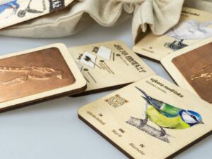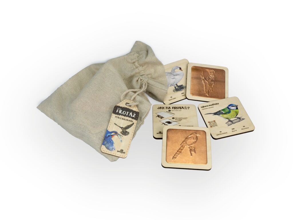 Je na čase objevit uměleckou techniku frotážování s unikátní sadou z Lesního Světa!Frotážovou sadu vyrábí u nás v dílně české ruce z kvalitního českého certifikovaného dřeva. Balení obsahuje 11 dřevěných karet včetně návodu o rozměru 9 × 9 cm s měděno-zinkovými nebo hliníkovými frotážovými destičkami a QR kódy. Zabaleno v přírodním látkovém pytlíku. Autorem kreseb jsou čeští ilustrátoři, obrázky jsou chráněny autorskými právy. Výrobek je zapsán v rejstříku chráněných průmyslových vzorů EU. Frotážová sada zábavnou a hravou formou seznamuje děti i dospělé s přírodou. Na každé kartě najdete věrnou ilustraci vybraného zvířete, QR kód, latinský název a také název ve slovenštině, němčině a angličtině. Z druhé strany každé karty je frotážová destička. Po stažení aplikace „Lesní Svět“ a načtení QR kódu, který naleznete na každé kartě, si můžete pustit hlas zvířete a dozvědět se spoustu dalších informací. Frotáž je výtvarná technika přenosu obrázku z šablony na papír. NÁVOD: Na šablonu která je na destičce, položte papír a obyčejnou tužkou po něm přejíždějte, až se obrázek na papíře objeví. Obsahuje tyto ptáky: vlaštovka obecná, sýkora modřinka, straka obecná, drozd zpěvný, káně lesní, puštík obecný, poštolka obecná, datel černý, ledňáček říční, labuť velká. Výrobek je zapsán v rejstříku chráněných průmyslových vzorů EU. Lesní svět = značka s ekologickým certifikátem udržitelného hospodářství PEFC. Všechny výrobky jsou vyrobeny s ohledem na životní prostředí.