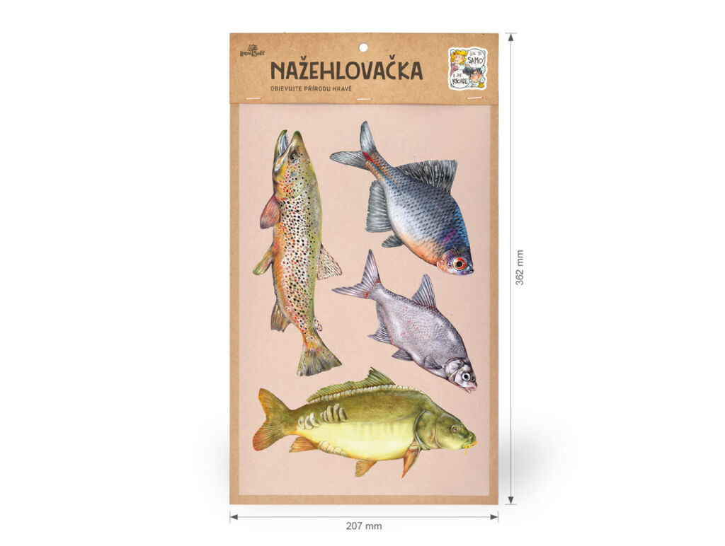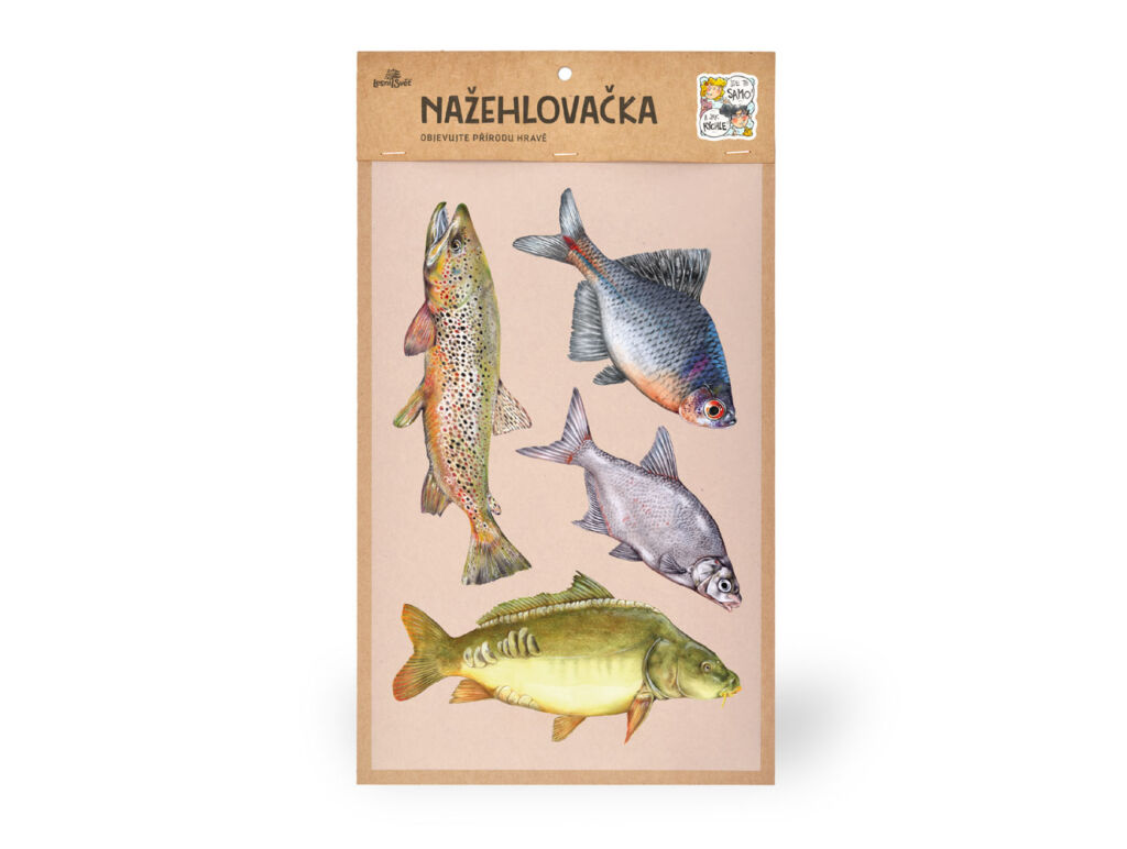 Vzory nažehlovaček: pstruh obecný, hořavka duhová, cejn velký, kapr obecný.