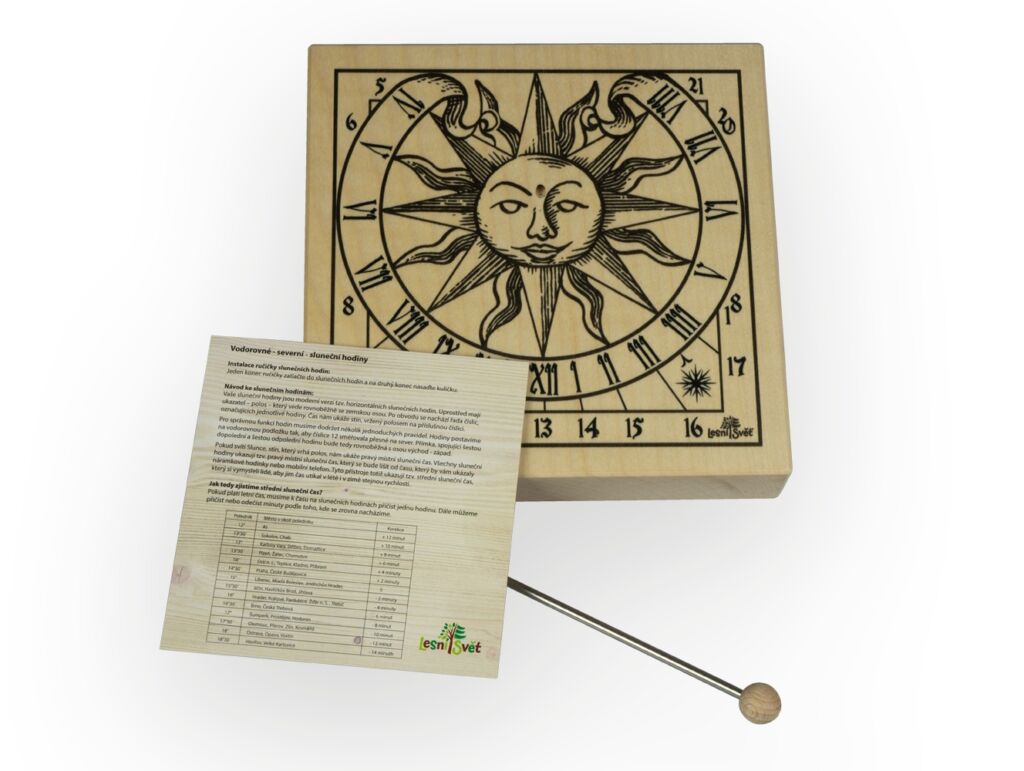 Balení obsahuje 1x sluneční hodiny z bukového masivu, 1x tyčku a dřevěný korálek k hodinám, 1x návod na používání hodin.