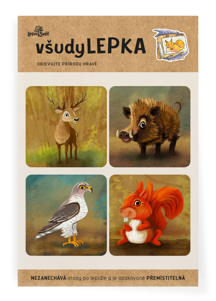 Vzor všudylepky: jelen, prase, sokol, veverka.