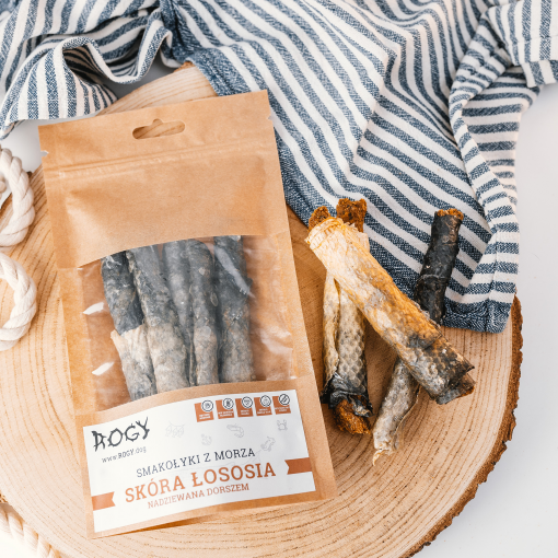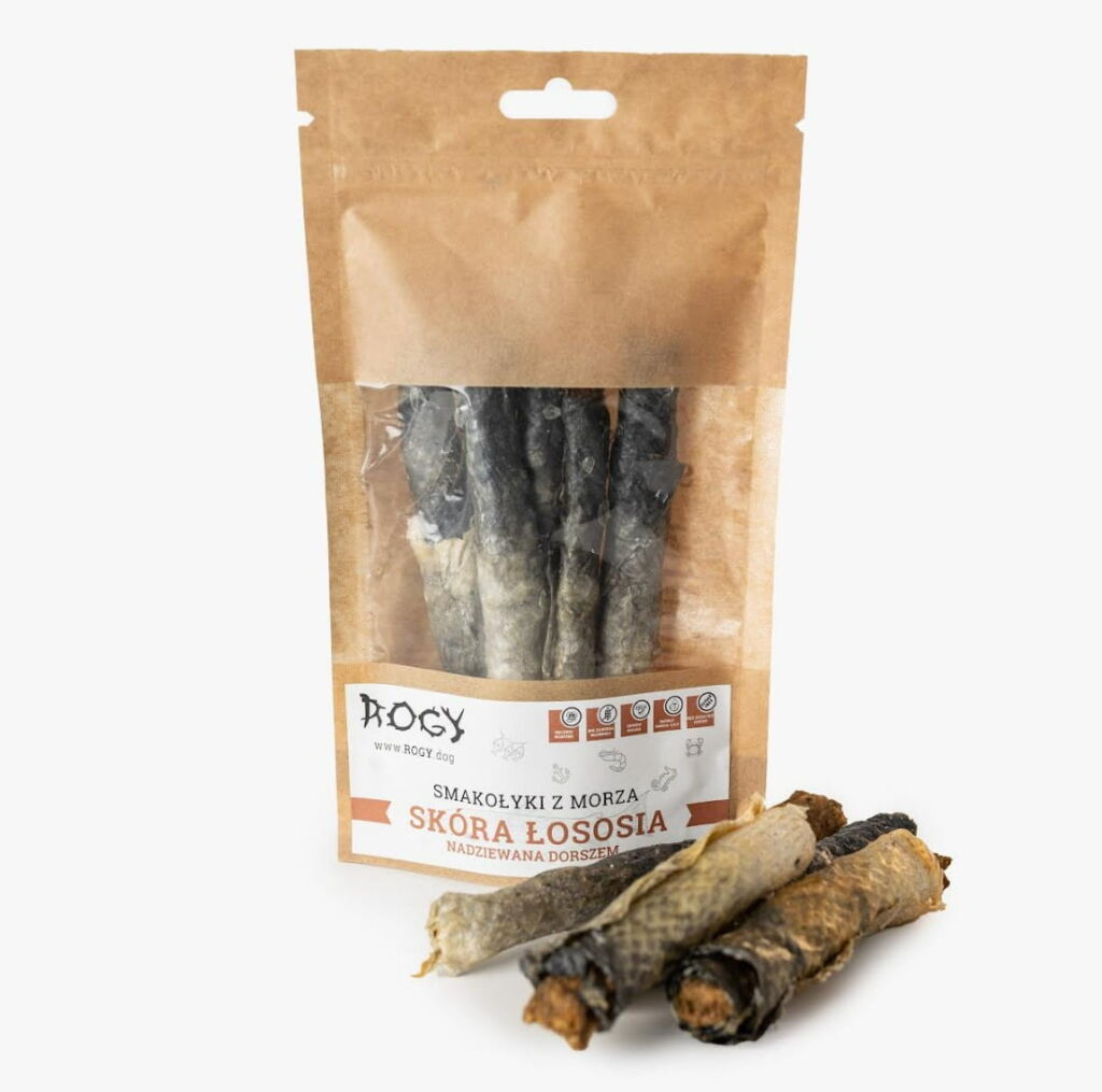 Ručně rolovaná lososová kůže plněná tresčím masem, sušená při nízké teplotě, díky čemuž neztrácí ty nejdůležitější ingredience.