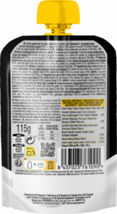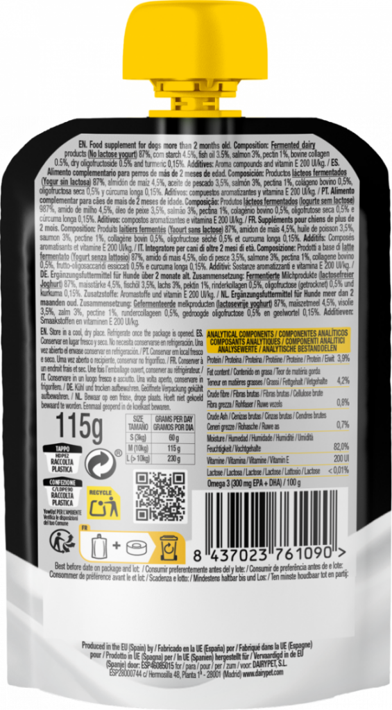 Složení: Fermentované mléčné výrobky (bezlaktózový jogurt) 87 %, kukuřičný škrob 3,5 %, rybí tuk 3,5 %, losos 3 %, pektin 1 %, hovězí kolagen 0,5 %, oligofruktóza v prášku 0,5 %, kurkuma 0,01 %, aromatické sloučeniny a