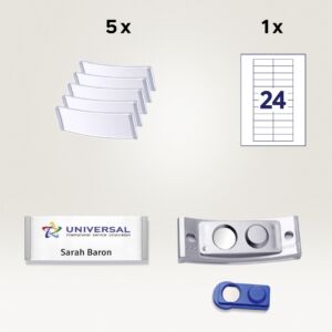 Sada obsahuje: 5 ks jmenovek, rozměr 68×22 mm, barva okrajů nerez ocel + 5 ks magnetů smag® + 24 ks štítků, rozměr 64×22 mm, 1 arch A4, gramáž 190 g/m2, barva bílá. Typ tiskárny: černobílá laserová, barevná laserová, inkoustová.