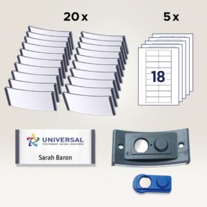 Sada obsahuje: 20 ks jmenovek, rozměr 70×30 mm, barva okrajů antracit + 20 ks magnetů smag® + 90 ks štítků, rozměr 65×30 mm, 5 archů A4, gramáž 190 g/m2, barva bílá. Typ tiskárny: černobílá laserová, barevná laserová, inkoustová.