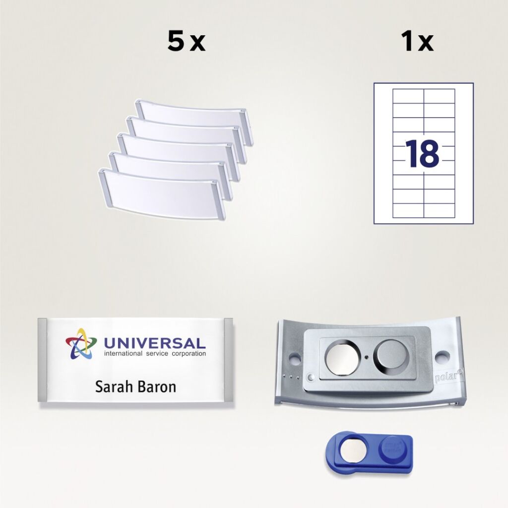 Sada obsahuje: 5 ks jmenovek, rozměr 70×30 mm, barva okrajů nerez ocel + 5 ks magnetů smag® + 18 ks štítků, rozměr 65×30 mm, 1 arch A4, gramáž 190 g/m2, barva bílá. Typ tiskárny: černobílá laserová, barevná laserová, inkoustová.