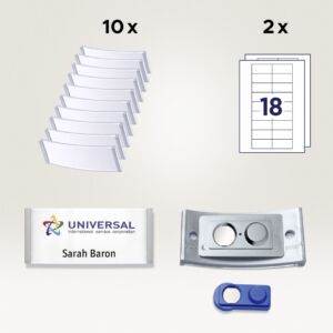 Sada obsahuje: 10 ks jmenovek, rozměr 70×30 mm, barva okrajů nerez ocel + 10 ks magnetů smag® + 36 ks štítků, rozměr 65×30 mm, 2 archy A4, gramáž 190 g/m2, barva bílá. Typ tiskárny: černobílá laserová, barevná laserová, inkoustová.