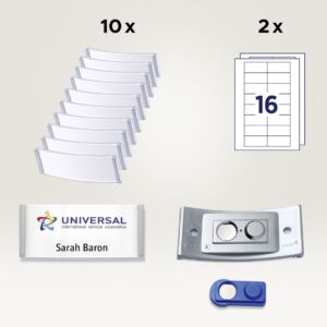 Sada obsahuje: 10 ks jmenovek, rozměr 80×34 mm, barva okrajů nerez ocel + 10 ks magnetů smag® + 32 ks štítků, rozměr 74×34 mm, 2 archy A4, gramáž 190 g/m2, barva bílá. Typ tiskárny: černobílá laserová, barevná laserová, inkoustová.