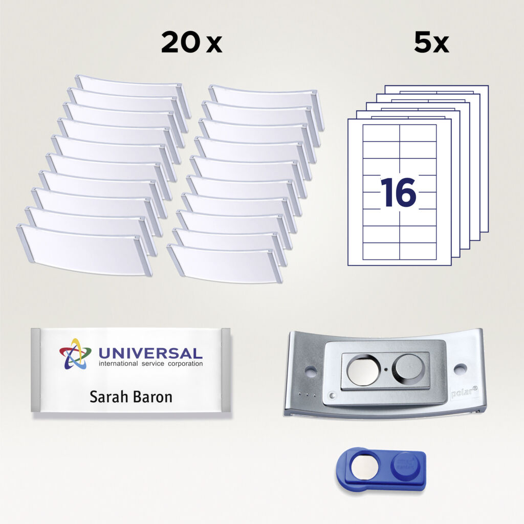 Sada obsahuje: 20 ks jmenovek, rozměr 80×34 mm, barva okrajů nerez ocel + 20 ks magnetů smag® + 80 ks štítků, rozměr 74×34 mm, 5 archů A4, gramáž 190 g/m2, barva bílá. Typ tiskárny: černobílá laserová, barevná laserová, inkoustová.