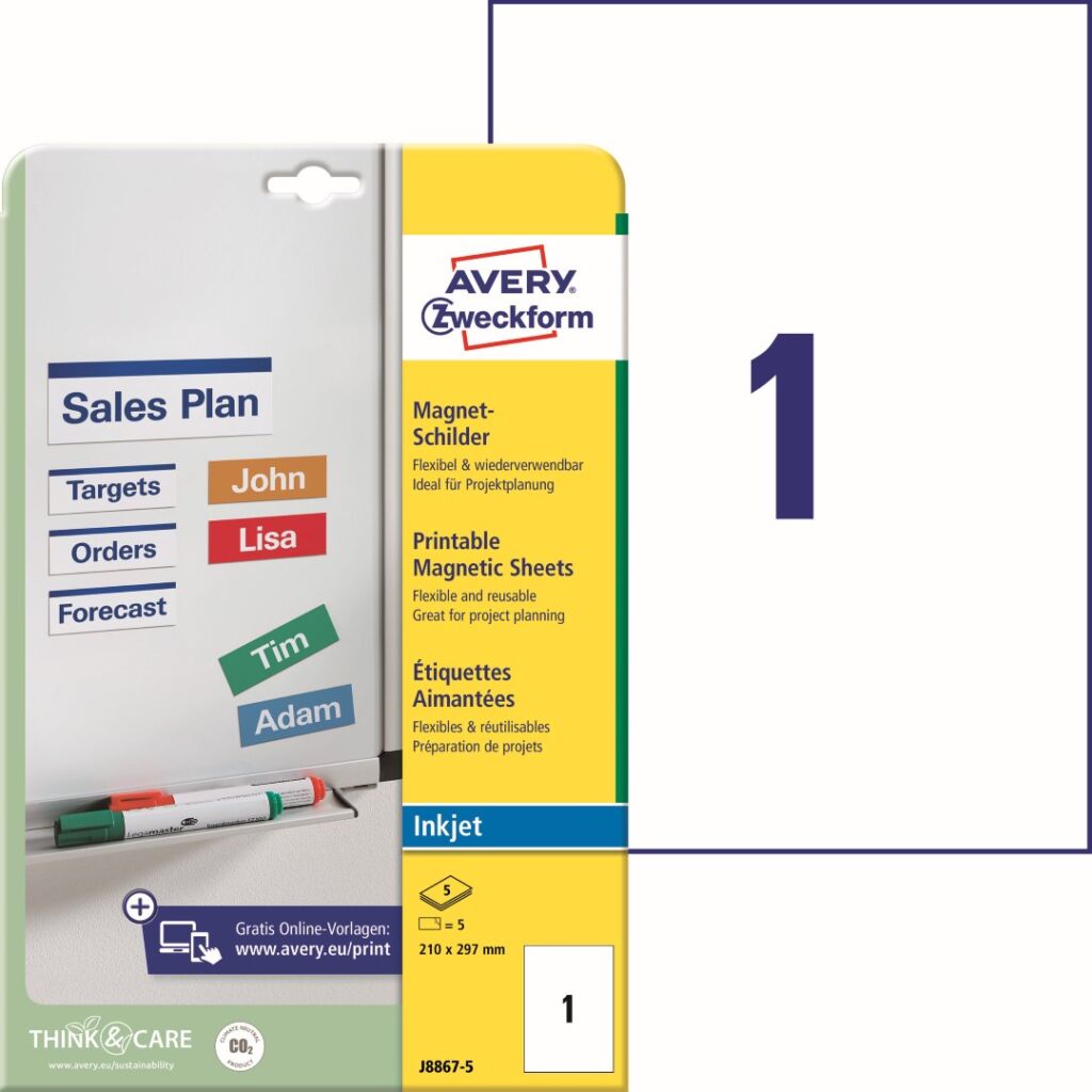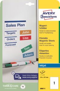 Potisknutelné magnetické štítky Avery Zweckform J8867-5 pro jednoduché a flexibilní označování kovových regálů, magnetických tabulí apod. Vytvořte a vytiskněte si vlastní magnetické štítky během několika minut, za pomoci svého počítače a tiskárny. Díky mikroperforaci lze od sebe jednotlivé štítky velice snadno oddělit a lze je libovolně přemisťovat a opětovně používat. Bílé magnetické etikety Avery J8867-5 jsou vhodné pro všechny běžné inkoustové tiskárny a hodí se i pro psaní, resp. ruční popis.