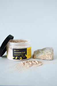 Čištění pleti: smíchejte marocký jíl s vodou nebo hydrolátem (např. růžová voda) v poměru 1:2, naneste na pokožku a krouživými pohyby myjte.
