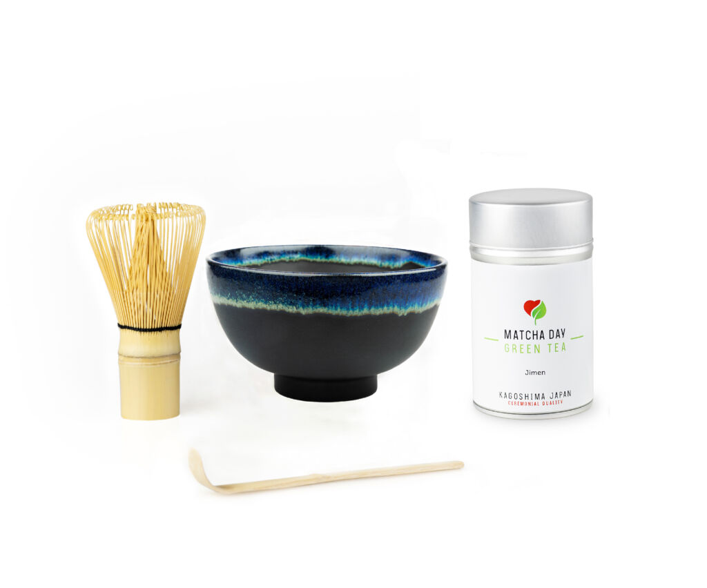 Set na tradičnú prípravu matcha čaju obsahuje ručne vyrobenú misku (chawan), bambusovú naberačku (chashaku), bamusovú metličku (chasen) a vami zvolený variant matcha čaju v plechovke.