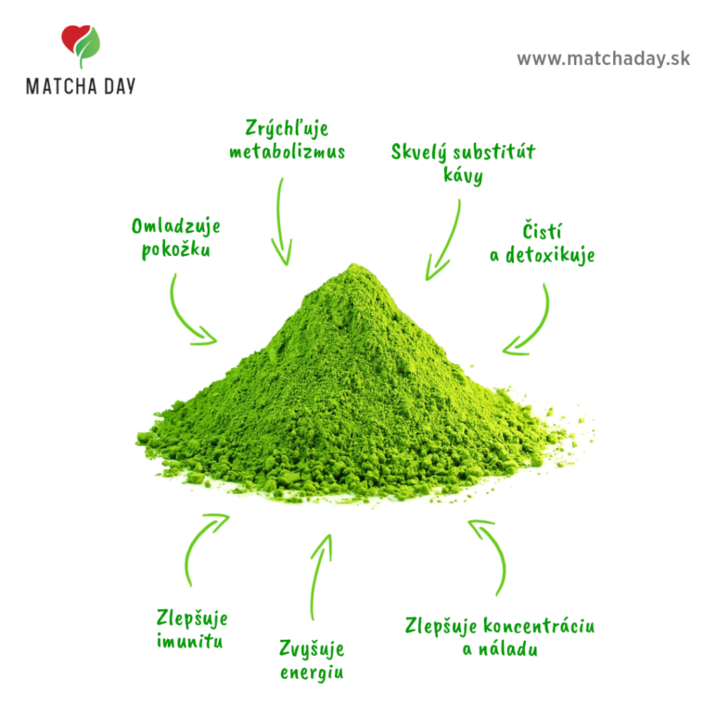 Matcha čaj je tradičný japonský zelený čaj, ktorý vzniká namletím čajových lístkov na jemný prášok. Tento prášok obsahuje širokú škálu živín ako sú antioxidanty, aminokyseliny, vláknina, vitamíny C, A, E, železo či vápnik v 10x vyššej koncentrácií ako bežný zelený čaj. Matcha čaj navyše obsahuje teofylín, obdobu čajového kofeínu, ktorá dodá dlhotrvajúcu energiu na 3-6 hodín a zlepšuje koncentráciu