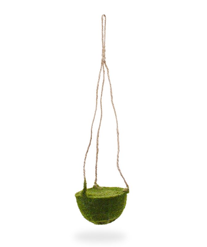košík z umělého mechu se zavěšením z jutových provazů. Ideální pro vytváření květinových dekorací. Košík je vyplněn aranžovací hmotou.