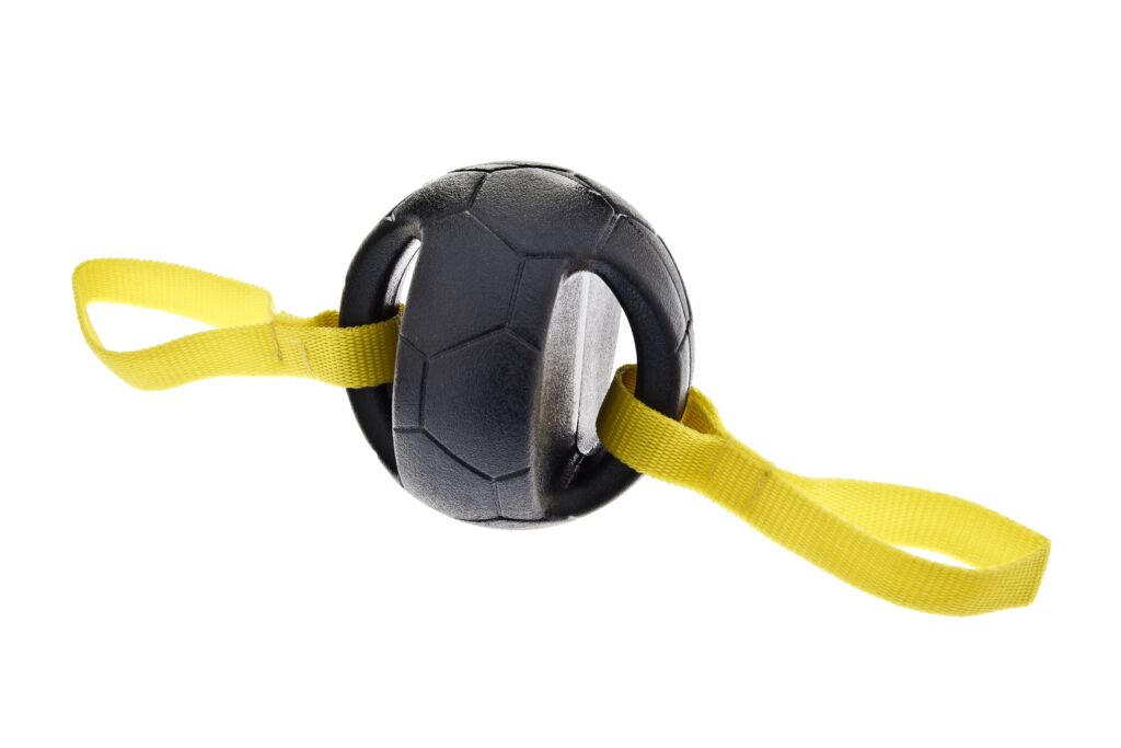 Pískací, aportovací míček s úchopy pro házení, nebo přetahování