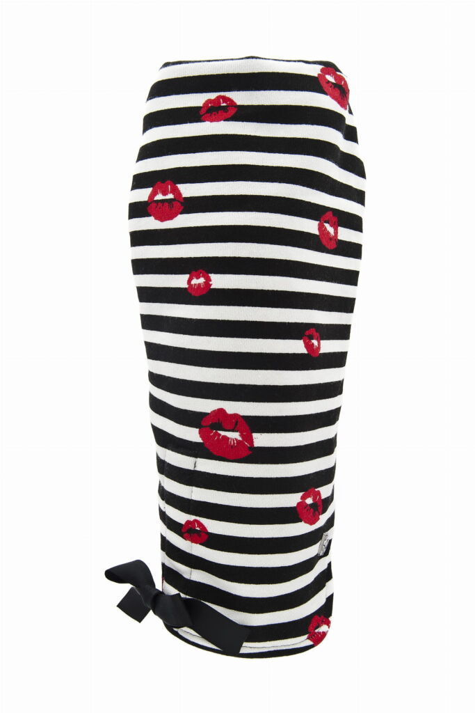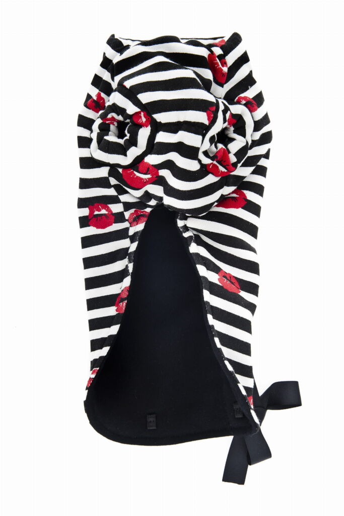 Okoukaný vzor pruhů s odraženými rty upoutá, navíc je mikina opatřena stuhou, která umožňuje vytržení oděvu.