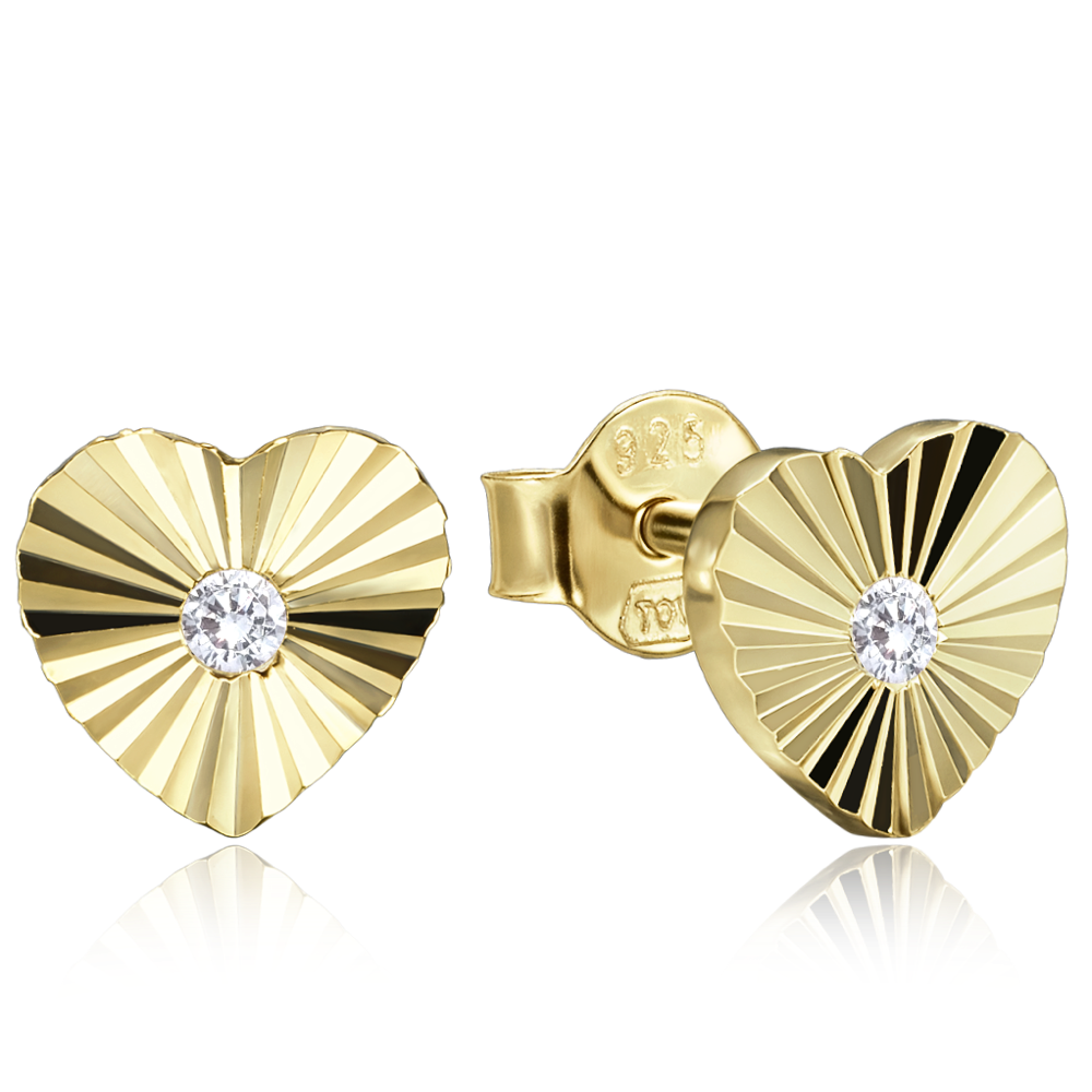 Pozlacené stříbrné náušnice MINET se srdíčky a zirkony jsou vyrobeny ze stříbra Ag 925/1000, pokovené vrstvou zlata a chráněné e-coatingem.