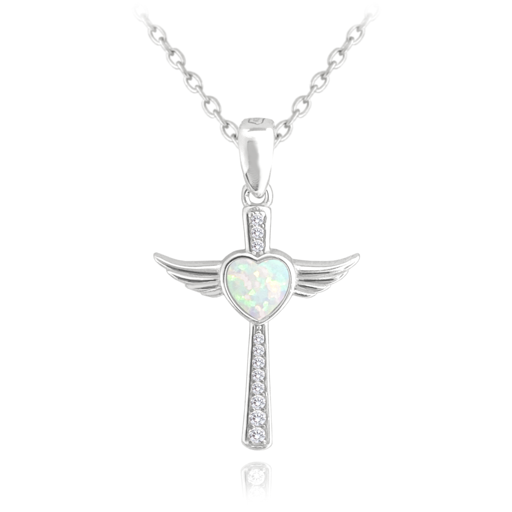 MINET Stříbrný náhrdelník ANDĚLSKÝ KŘÍŽEK s bílým opálovým srdíčkem