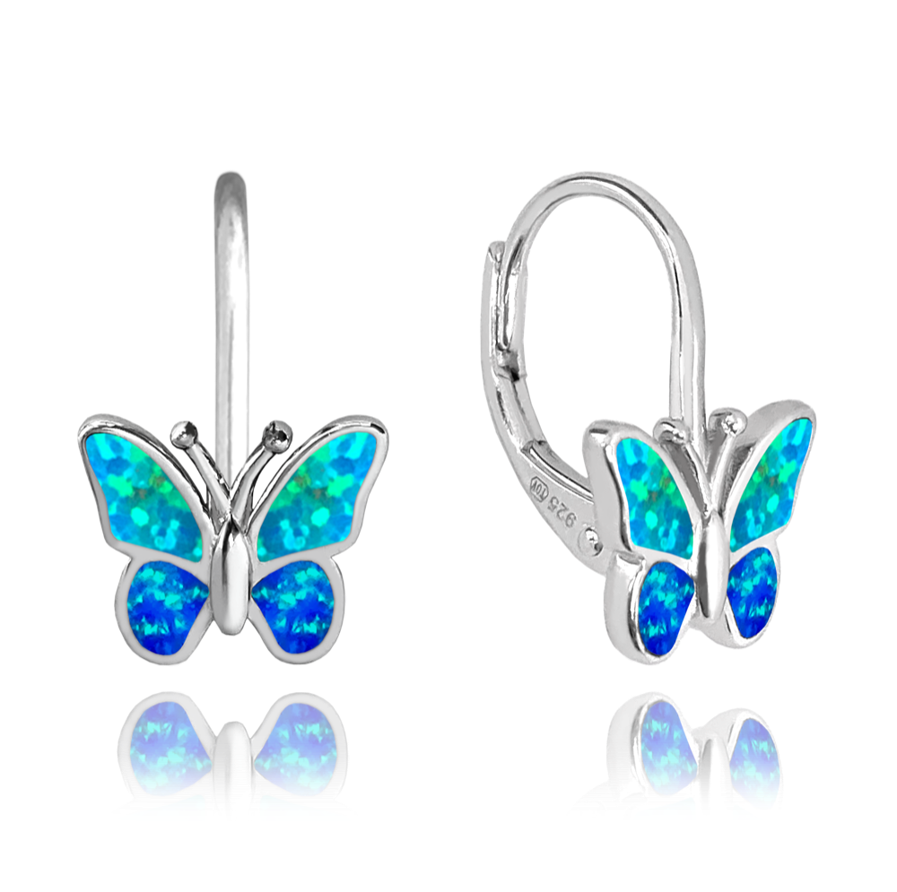 MINET Třpytivé dětské stříbrné náušnice MOTÝLCI s modrým opálem