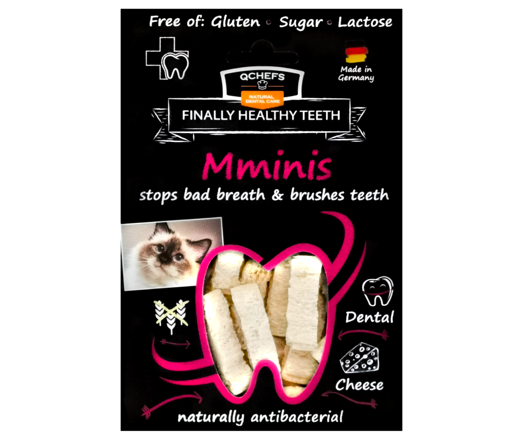 QCHEFS Mminis redukují 80 % bakterií v ústech. Speciální technologie se postará o rozpuštění zubního kamene a zanechá tlamičku kočky čistou. QCHEFS pamlsky jsou vyrobené z přírodních ingrediencí a navíc doplňují kočičce potřebné vitamíny a minerály.