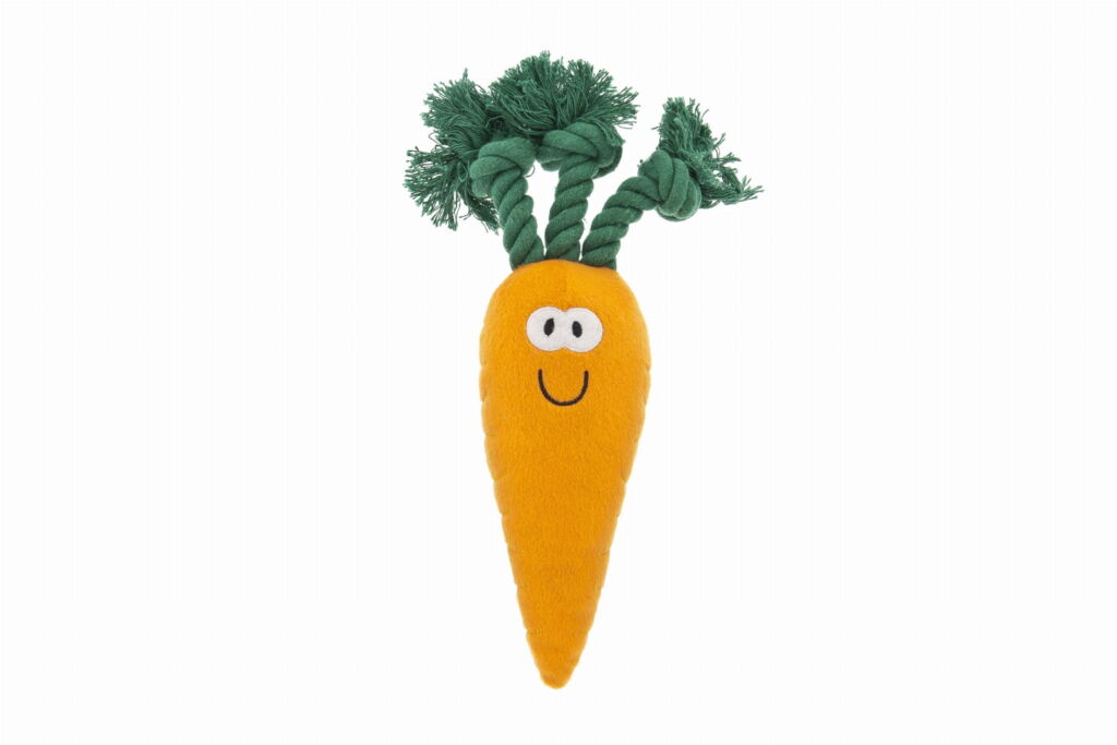 Nepodceňujte nať mrkve! Stejně jako v případě opravdové zeleniny má i tady velký přínos - zelené bavlněné provázky slouží kromě snazšího uchopení k jemnému čištění zubů. Hra s pejskem je teda povýšená na něco víc než jen obyčejnou zábavu.