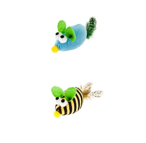 Hračky pro kočky prodávané v párech ve tvaru myšek s péřovým ocáskem.
