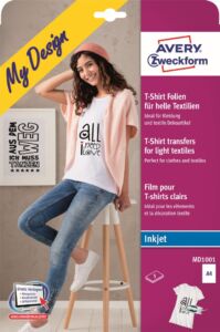 Nažehlovací fólie Avery Zweckform MD1001 vhodná pro všechny bavlněné textilie v bílých nebo světlých pastelových odstínech. Konečně originální dárek! Navrhněte si sami vlastní tričko pro rodinu nebo přátele. Vyberte si skvělou fotku, vtipný výrok nebo parádní obrázek. Vlastní motiv si rychle a jednoduše vytvoříte na počítači. Samozřejmě si můžete potisknout nejen trička, ale také polštáře, zástěry, ubrusy a jiné textilie nebo oblečení. Zažehlovací fólii Avery Zweckform MD1001 potisknete na každé běžné inkoustové tiskárně a nažehlíte. Po nažehlení můžete textil prát na 30°C (cca 20x).