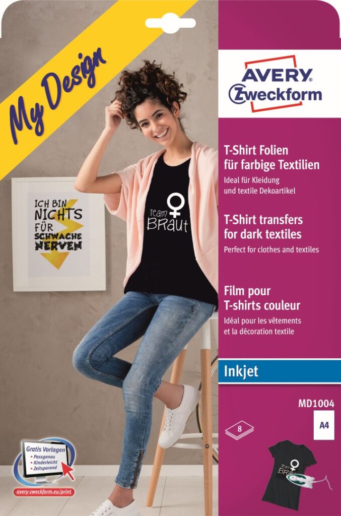 Nažehlovací fólie Avery Zweckform MD1004 vhodná pro všechny tmavé a barevné bavlněné textilie. Potřebujete vlastní dresy pro svůj tým na příští sportovní turnaj? Vytiskněte si je sami, např. se startovními čísly, maskotem týmu, logem sponzora atd. Vlastní motiv si rychle a jednoduše vytvoříte na počítači. Samozřejmě si můžete potisknout nejen trička, ale také polštáře, zástěry, ubrusy a jiné textilie nebo oblečení. Zažehlovací fólii Avery Zweckform MD1004 potisknete na každé běžné inkoustové tiskárně a nažehlíte. Po nažehlení můžete textil prát na 30°C (cca 20x).