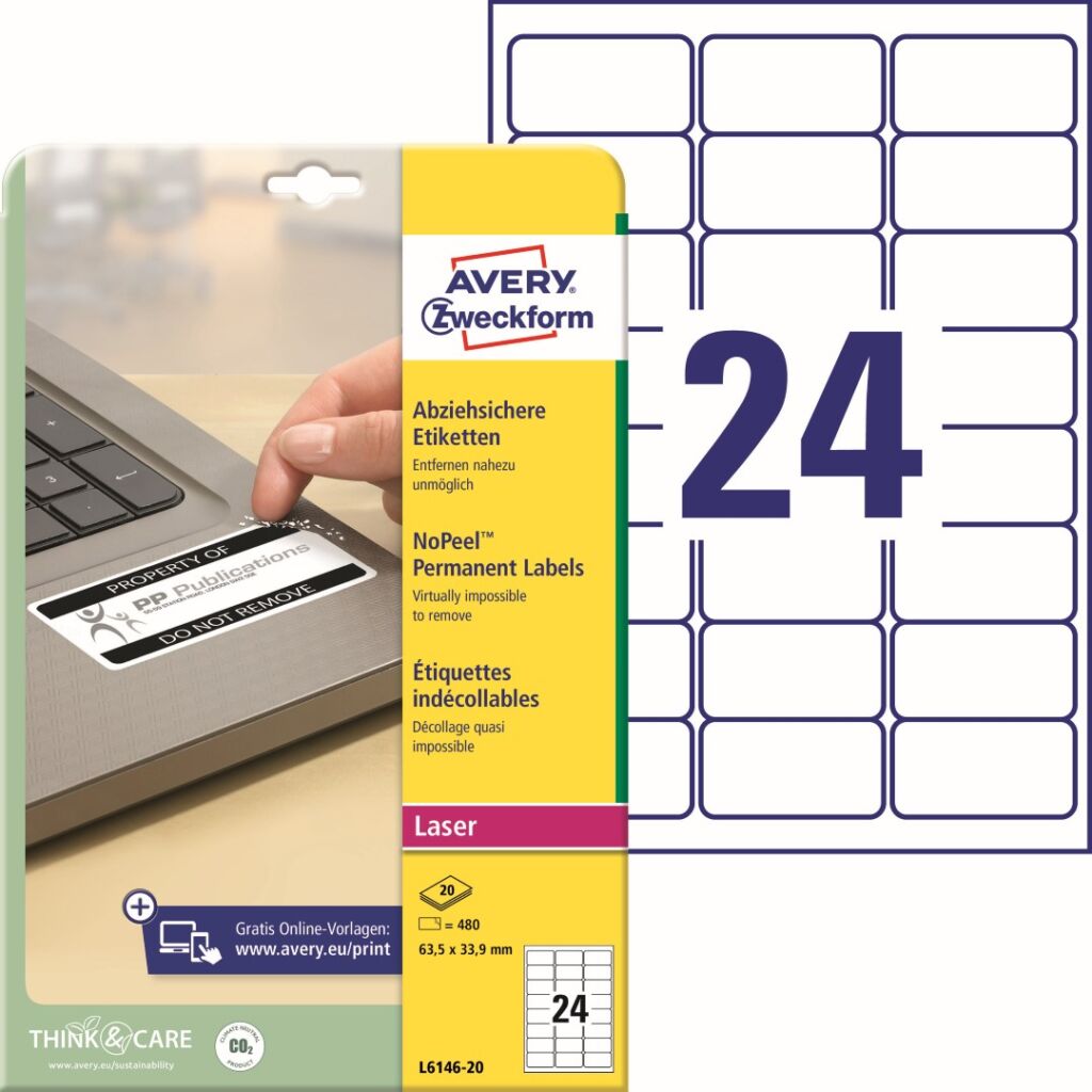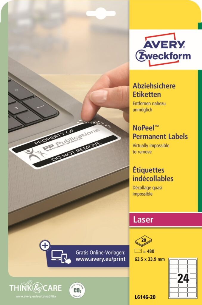 Neodlepitelné etikety Avery Zweckform L6146-20 jsou ideální jako kontrolní plomby, kalibrační údaje, bezpečnostní varování, záruční informace, trvalé značení majetku, inventáře, elektroniky apod. Pokusy o neoprávněnou manipulaci jsou ihned viditelné rozpadem materiálu a etiketu lze jen těžko odlepit po velice malých částech. Jsou trvanlivé, odolné vůči stříkající vodě, nečistotám, mastnotě a teplotám od -40°C do +100°C. Při tisku se můžete spolehnout na plynulý průjezd archů tiskárnou bez uvíznutí a ostrý tiskový výstup, který se díky vynikajícímu ukotvení tonerového prášku nerozmazává. Samozřejmostí je čtyřstranný bezpečnostní okraj QCT (Quattro Clean Technology), který zabraňuje vytékání a usazování lepidla v tiskárně. Potisknutelné štítky s ochranou proti manipulaci Avery L6146-20 jsou vhodné pro všechny běžné černobílé laserové tiskárny. Etiketa je stává „neodlepitelnou“ 24 hodin po aplikaci!
